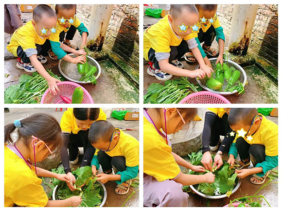 小朋友们化身成洗菜小帮手,他们用自己的小手,认真仔细清洗着每一片菜叶!